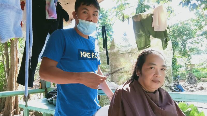 In de vroege ochtend komt een broeder die kapper is langs om ons beiden te knippen